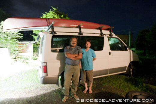 お宅に伺うと、家の前にカヌーをのせたバンが。これにBDFを入れて、ゲストと共に川やフィールドに向かうのだろうな。
