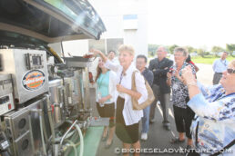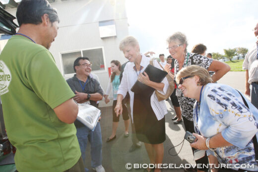 「プラント制作にかかった金額は?」 「どうやって寝泊まりしているの?」 「精製にかかる時間は?」 など質問が飛び交う中、ジャニス・ペリーノ市長自ら廃油を注いで頂いた。