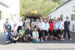 サマーランド市からの訪問団は、市長や市議、中高生など総勢16名。ジャニス・ペリーノ市長(大写真中央)をはじめ、みんな身を乗り出してバスコファイブを前から後からぐるぐると見学。
