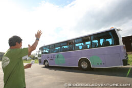 じつは豊頃町はカナダのサマーランド市と国際姉妹都市。ちょうどこの日はサマーランド市からのゲストがBDFファクトリーを見学に来るそうで、グッドタイミングなので、バスコファイブも展示して見て頂くことになったのだ。