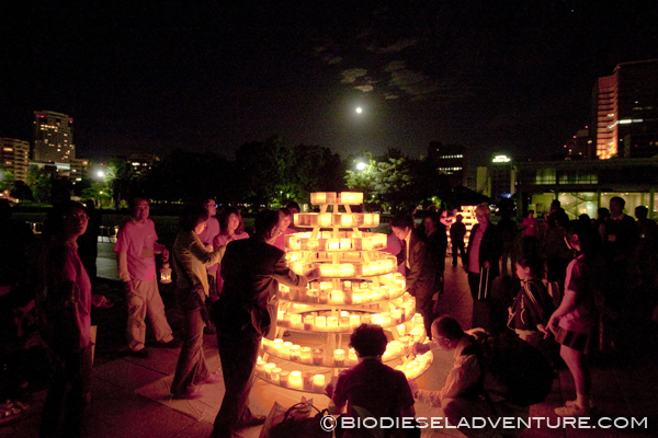 原爆ドーム、資料館を見学。そして夜はキャンドルナイト。たくさんの願いが記されたキャンドルの塔が幻想的だった。