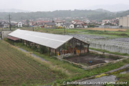 BDF精製施設の裏のドアから低地を見ると、ブタ小屋が。裏山に放牧して耕すために飼い始めたのだそうだ(写真右)。