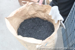 左の写真は竹炭。竹はチップにすると、発酵熱で60〜65度にもなる。堆肥に使用している他、マルチング(土を覆う。普通はビニールを使う)に利用するそうだ。