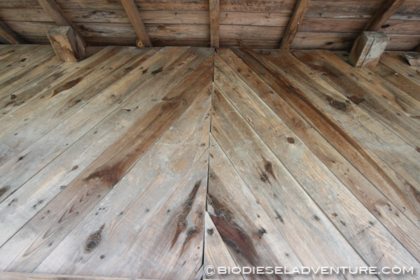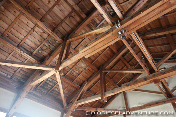 <<貯蔵や作業場に使っている建物。おさえをしながら斜めにはわせる。地震に強く横揺れからタテ揺れにも強いのだとか。 精製されたBDFは地元のバス会社「(有)大朝交通」の大朝〜芸北・美和間路線の1台に使用され、年間約6000リッターのBDFを消費。B100で動かしている。