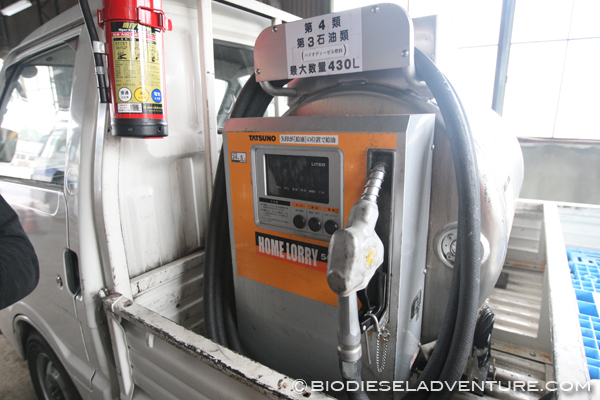BDFを一時貯蔵したり、給油で使用しているのが、マツダのボンゴ(写真下左)。荷台に給油機が搭載されている。じつはこのNPOの取り組みはマツダの助成金が下りているので、この車がピッタリとのことで選んだそうだ。給油に使っているホース類は、フッ素加工などされていない。BDFでどれくらいもつのかどうか、試しているとのこと。