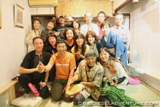 そうして、うずめさんが、交流会パーティに唐揚げをあげてくれ、その廃油をみんなが僕のバスコファイブに注いでくれた。その後で、道路の両脇にみんなで並んで、ふるさとを大熱唱! 思い出深いすばらしいコラボが実現した。
