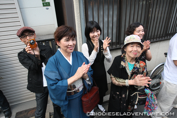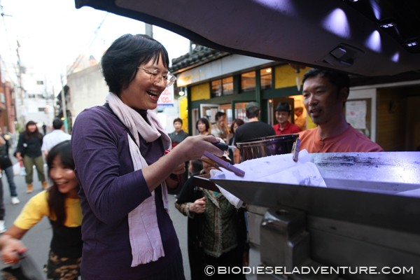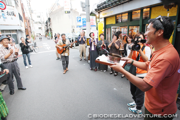 そうして、うずめさんが、交流会パーティに唐揚げをあげてくれ、その廃油をみんなが僕のバスコファイブに注いでくれた。その後で、道路の両脇にみんなで並んで、ふるさとを大熱唱! 思い出深いすばらしいコラボが実現した。