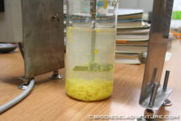黄色く染まった排水に、ある粉を投入して、グルグル撹拌。すると、排水にとけていた不純物が凝固した。不純物はみるみる固まって下へ沈殿した。