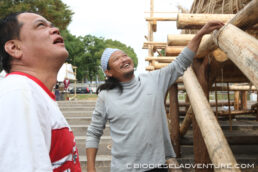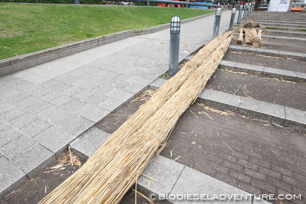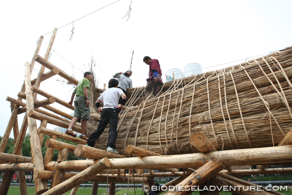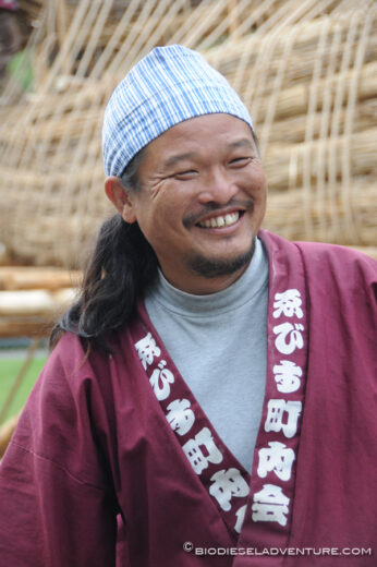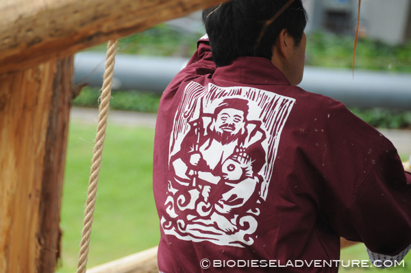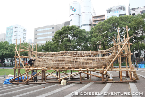 葦船の全長は12m。足組の上に浮かせるようにして形を造る。葦を束ねて、縄でくくっていく。この時はちょうど数人が石川さんの指示で縄を操り上から下から作業中。船の中心部の葦を束ねて中へ入れる作業を行っていた。はっぴを着た仲間たちは、仮想の町内会”えびす町内会“のメンバーたちだ。