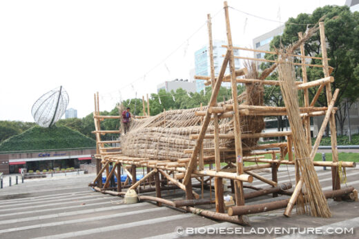 写真でしか見たことのない葦船を、都会のど真ん中で造っているとは! どうしてもその姿を見たくて、名古屋の中心部まで足を延ばした。