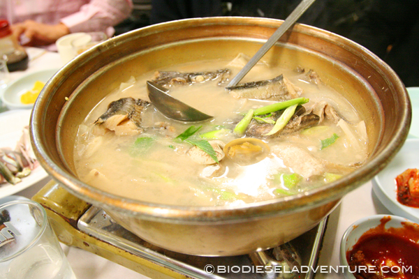 じつは僕は辛いものが苦手。それを知って、なんと辛くない魚鍋を用意してくれたのだった(韓国料理が大好きな方たち、すみません…)。何種類ものキムチやお刺身もあわせてテーブルにずらり。
