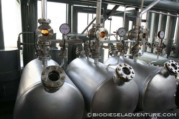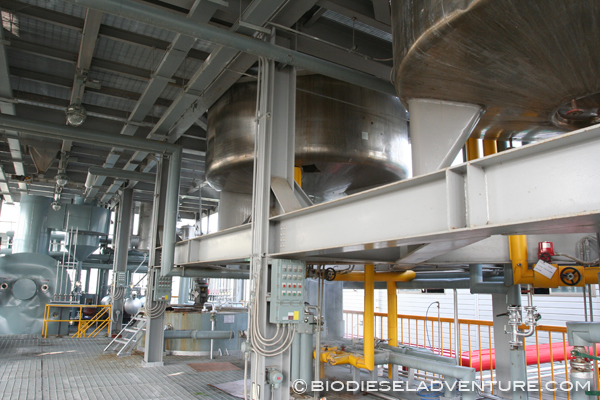 施設はものすごい巨大だった。反応タンクは一度に33トンほどの量を反応できる。最終工程の蒸留には、方法の違う2つのシステムを使用する。