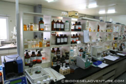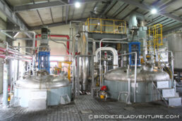 気になったのがグリセリンの処理。現在では回収業者に販売している。いっぽう施設内で、純度の高いグリを抽出したり、脂肪酸の多いグリをBDF生産に回すための研究を進めているという。この施設を見たところ、BDF精製工程で巨大ボイラーを使用していたので、その気になればそれにも利用できそうだな。