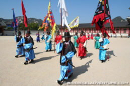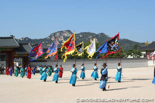 門と門の間にある広場では、朝鮮時代の守門軍の交代儀式が行われていた。鮮やかな伝統衣装をまとった守門将が白虎、青龍、亀、鳥の動物が描かれた旗を掲げ、鋭いまなざしで歩いていく。まるで朝鮮王朝にタイムスリップしたみたいだ。