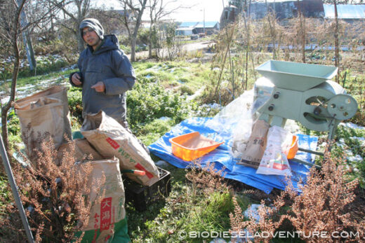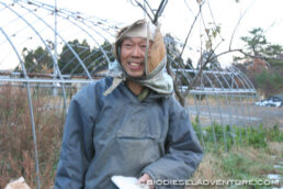 定岳さん、今年は完全無農薬・手作業で米づくりにチャレンジしたそうで、今日はその脱穀中。「お米作るのってほんと楽しいの〜♪」とまんべんの笑顔。