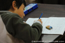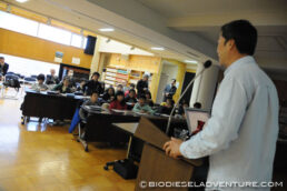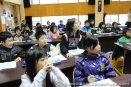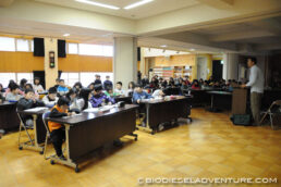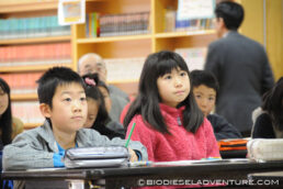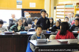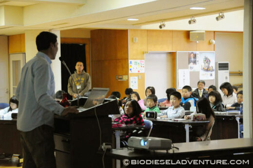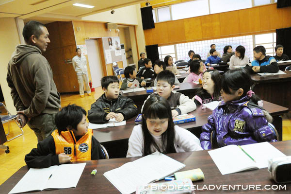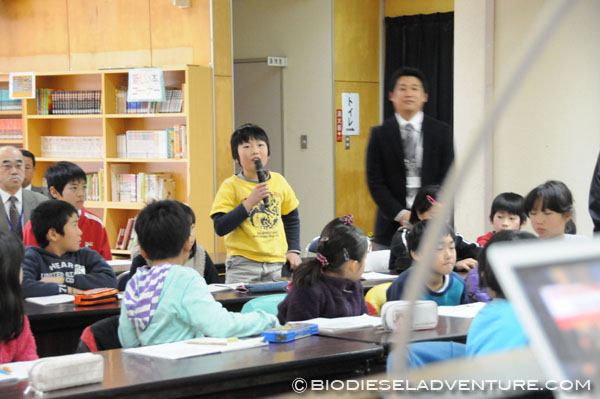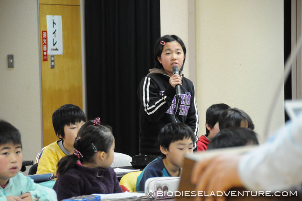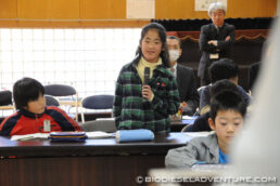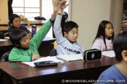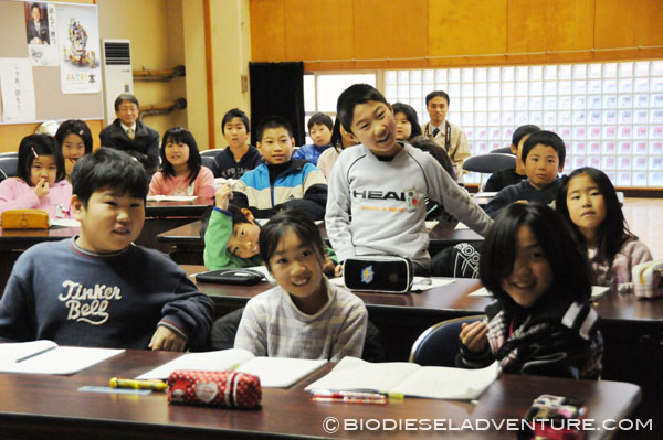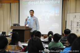 写真と映像に合わせて世界一周の旅の模様を話していく。子供たちは真剣な表情でメモを取りながら聞いている。できれば僕は、もっともっとキャッチボールがしたい! と、こちらから質問を投げかけていくと、子供たちもだんだん表情がほぐれてきた。