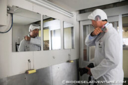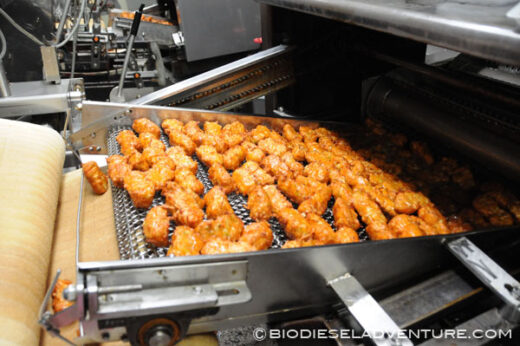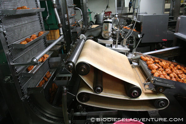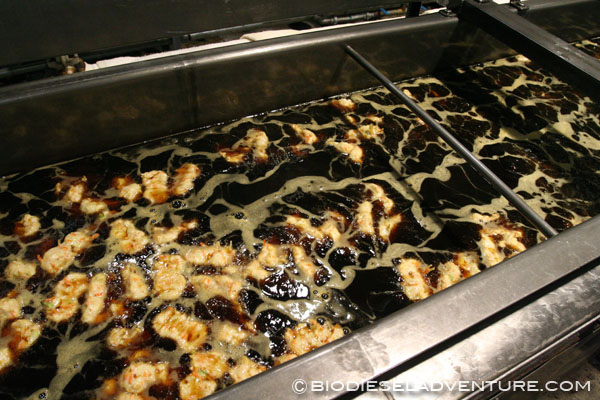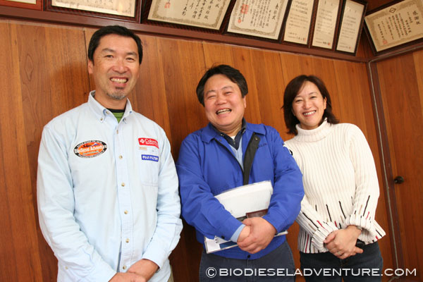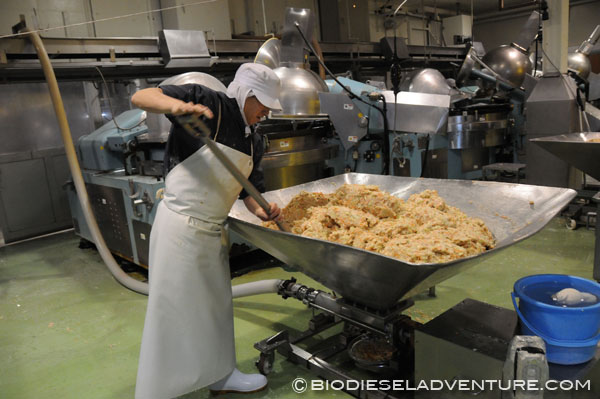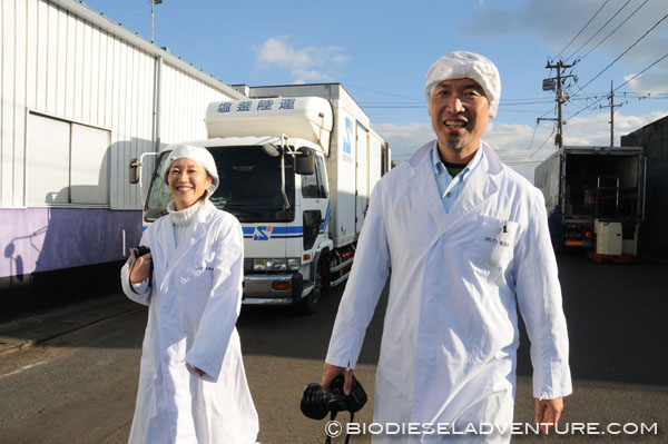 廃油はすぐ近くの塩竈市団地水産加工業協同組合が買い取り、BDF精製に使用してリサイクルしている。この工場内では1日なんと4000リッターもの廃油がでるそうだから、利用しない手はない。地域内の名産とリサイクル。この連携プレイはすばらしいですね!