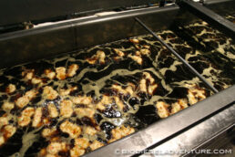 全長5mほどはあろうか、油のラインをかまぼこが流れつつ、次々揚がっていく。辺りには香ばしい油の香りが漂ってます。
