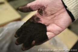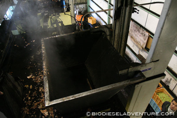 肥料にするにはまず野菜を砕いて脱水して投入。第一発酵槽から第二次発酵槽を通り、ひと晩でうそみたいに真っ黒な土になるのだ。中は60〜70度で、発酵菌が生きている。