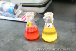 魚油から作ったBDFは鮮やかな赤色をしている。フラスコBの色、すごいでしょう!? 匂いも、猫が喜ぶほど(!)おサカナの香りがするのだ。