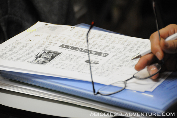 「……”産廃”ってわかります?……」などと、難しそうなキーワードを確認しても、皆さん「ウンウン」とうなずいてくれる。わからないキーワードも、聞きながら電子辞書でささっと調べていく。昨年掲載された新聞記事を、あらかじめ読んで予習までして頂いていたとのことで、気が付いたら僕はいつもと変わらないスピードで話してました(笑)