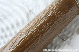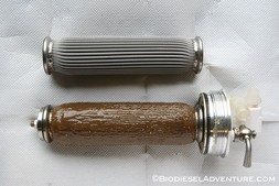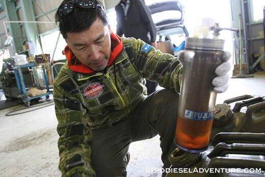 最近廃食油から反応タンクの中間にあるフィルターが寒さのためもあるのか、廃食油を通さなくなってきた。2009年5月31日に富士フィルターの協力で新開発していただいたオリジナルフィルターは、約1年7ヶ月ほど経つこの日まで一度も洗浄やメンテナンスすることなく動いてくれた。以前つけていた既製のフィルターは1ヶ月と持たなかったので、これは驚異的な能力だったと言える。