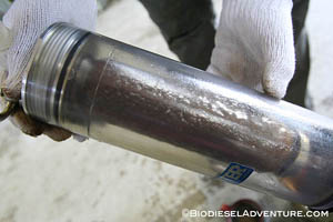最近廃食油から反応タンクの中間にあるフィルターが寒さのためもあるのか、廃食油を通さなくなってきた。2009年5月31日に富士フィルターの協力で新開発していただいたオリジナルフィルターは、約1年7ヶ月ほど経つこの日まで一度も洗浄やメンテナンスすることなく動いてくれた。以前つけていた既製のフィルターは1ヶ月と持たなかったので、これは驚異的な能力だったと言える。