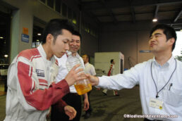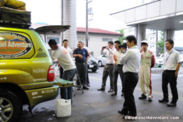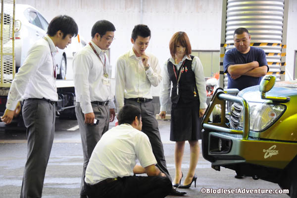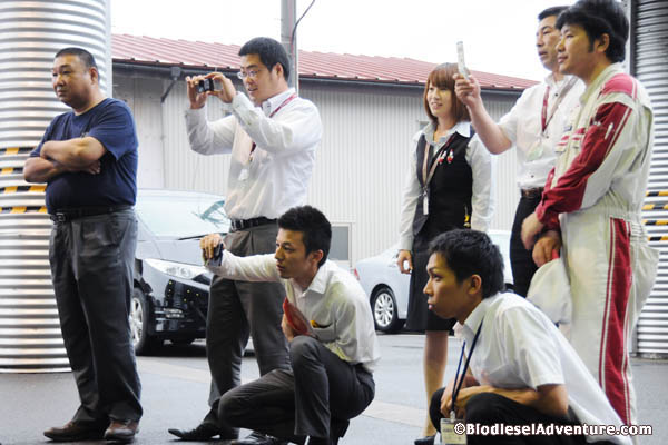 ……と間もなく、社員の皆さんがどんどんやってきて車を囲んで大撮影大会が始まった。クルマを前から横から、さらにグルッと回って下をのぞき込んだりと、皆さん本当に熱心に見て頂いた。さらには油まで用意してくれていたのだ。突然の訪問にも関わらずこんなに温かい歓迎を頂いて、ほんとうにうれしい限りだ。