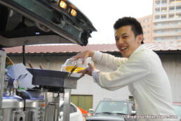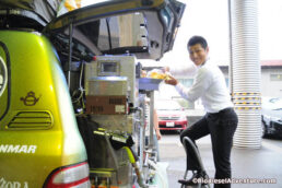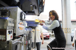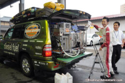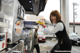 施設を見せて頂いた後、道路に面した「BDFステーション」で、BDF燃料を分けて頂いた。ステーションには「セルフ」の文字が書かれている。人件費を削減するために、カードでの購入に徹底したエコステーションだ。