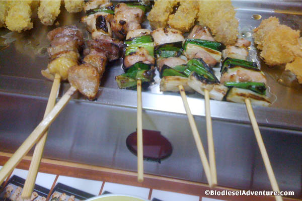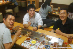 夕食は福井名物の串焼き屋「秋吉」へ連れて行ってくれた。これがまたおもしろい。ひと口サイズだから、1人20、30本は当たり前。4人で軽く100本以上はたいらげた! ここは家族で食べられる珍しい焼き鳥屋さんで、最近は東京にも店舗を構えるとか。いくらでも入ってしまいそうな焼き物を男4人でつつきながら、熱いトークは止まらない! こうして夜は更けていくのであった……