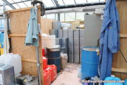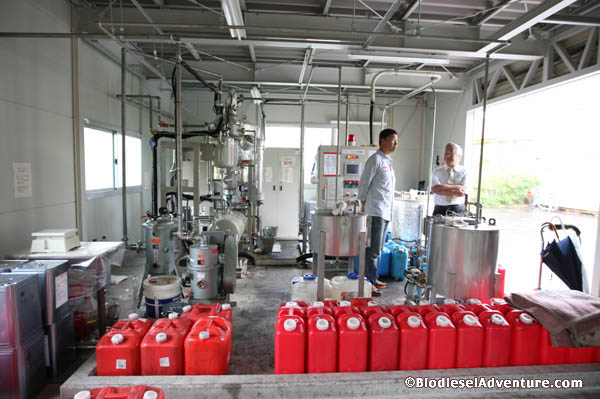 温室スペースにはプラントや廃油が整頓され置かれていた。プラントはセベックのEOSYS-50(1バッチが100リッタータイプ)。西日本ではあまり見る機会がなかったプラントなので、何だかとても懐かしい。この施設では月700リッターを精製、毎日稼働しているそうだ。