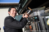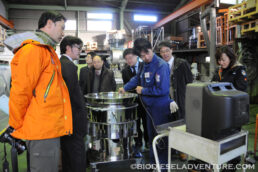 講演後、青空のもとでプラントを公開。ブルーの作業服を着た方々は晃栄産業の皆さん。作業の手をとめて見に来て頂いた