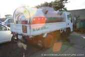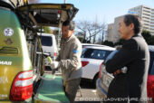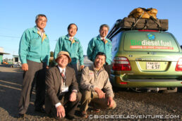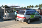 <<給油するローリー車など社の使用車の約20台は自社BDFを100%で使用。真ん中はお隣の福祉施設「みのり会」の施設長さんの車で、こちらもBDF100%。